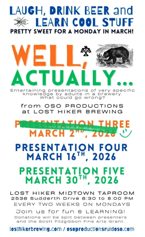 Laugh, drink beer and LEARN at Lost Hiker! Enjoy fun and informative presentations from 6:30pm-8:30pm. Don’t miss the last two this month: March 16th and March 30th. Donations will be accepted for this event and are split between presenters and the Scott Fitzgibbons Fine Arts Grant.